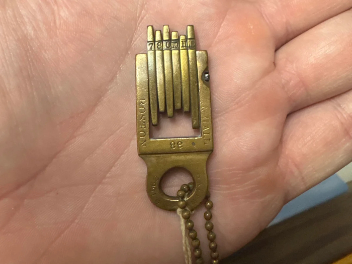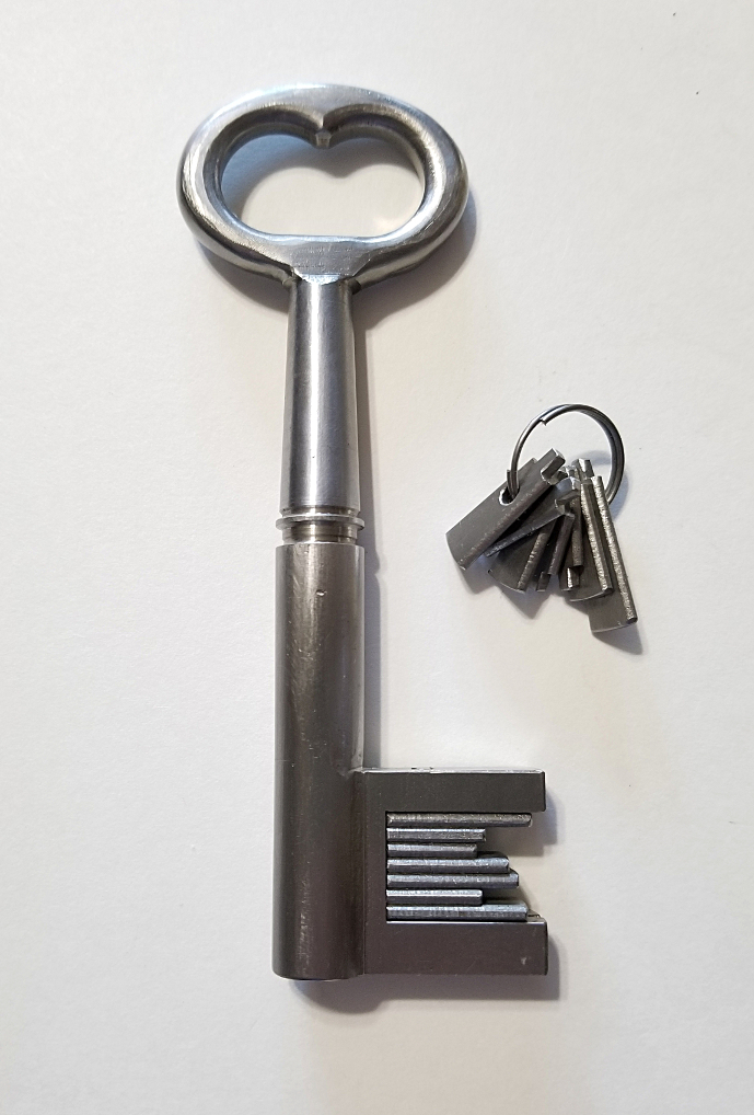 Это многоэлементный сейфовый ключ XIX века с поворотными битами\штырьками на общей оси, где каждый их них можно использовать любой стороной, резко увеличивая количество комбинаций и защищая замок от вскрытия и подрыва.. Логика простая - полоски внутри не ровно посередине прикреплены, как следствие, вариантов комбинаций 64, для замков в 1860-х помогало спастись от подбора. Ну и выживание банкиру обеспечивало - ключ при живом банкире более полезен.