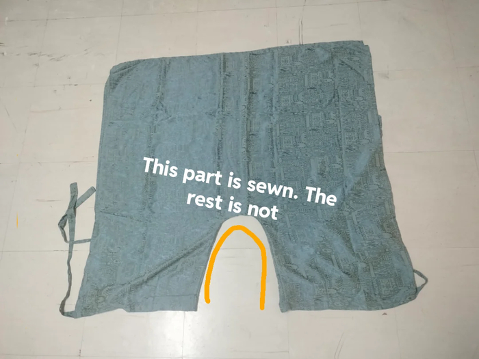 Это тайские штаны сарон. Отмеченное желтым будет между ног. Логика простая - поставили ткань вырезом между ног, завязали передние полуштанины, потом задние полуштанины. Видео смотрите, в общем :)