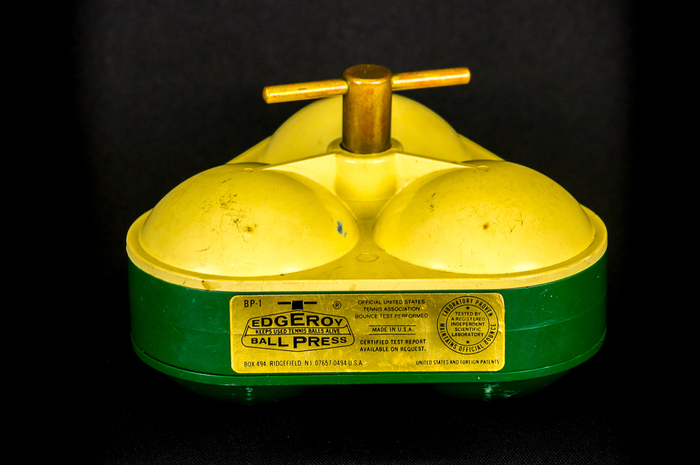 А это пресс для теннисных мячей. Держит их под давлением, сохраняя им упругость. Слоган, как я понимаю, "Хочешь, чтобы твои шары были упругими? Сжимай их каждый день!"