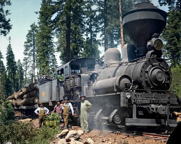 На снимке необычный лесовозный паровоз Эфраима Шея, запатентованный в США 14 июня 1881 года. Это была машина, созданная не для скорости, а для максимальной тяги: несмотря на крайне низкую скорость, она уверенно справлялась с уклонами до 10 градусов.