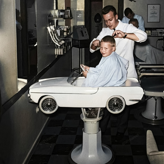 Мальчик стрижется в парикмахерской, 1963 год.