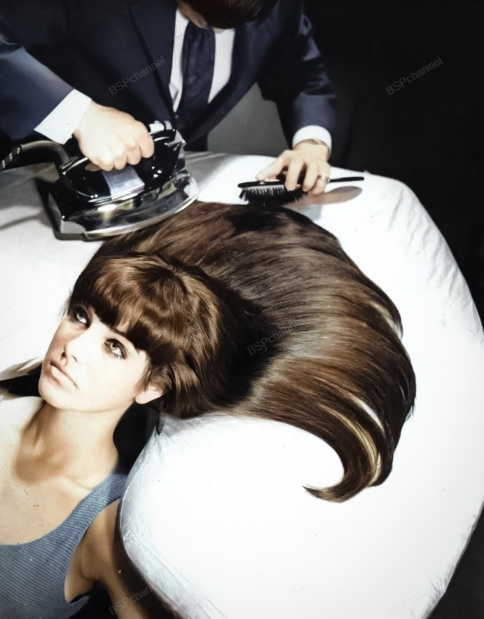 Парикмахер расчесывает и гладит волосы модели на доске, предназначенной для глажки волос. Нью-Йорк, 1965 год.