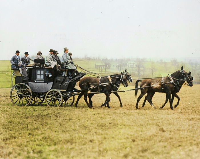 Девять человек в дилижансе, запряжённом четырьмя лошадьми. США, Вирджиния, 1926 год.