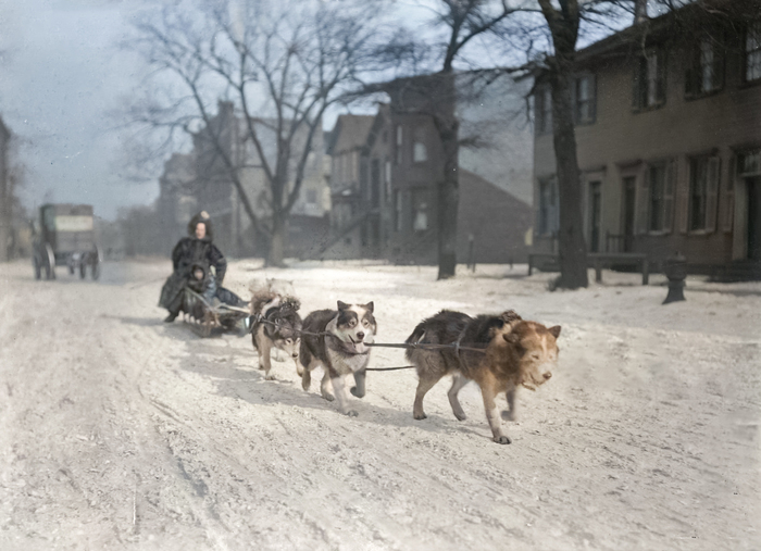 Хаски тянут сани со взрослым и ребенком, едущими по заснеженной жилой улице, Чикаго, штат Иллинойс, около 1904 года.