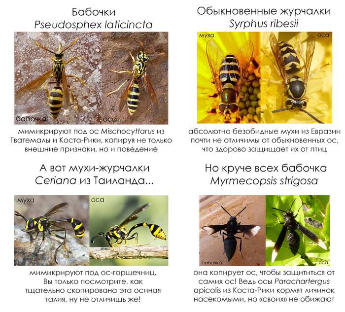 И вновь суббота, а это значит, что я несу вам четыре факта, которыми удивляю школьников на уроках биологии. Сегодня подборка посвящена ещё нескольким мастерам мимикрии, которые защищаются от хищников, копируя внешность разных ос.