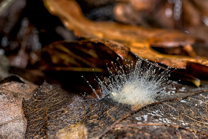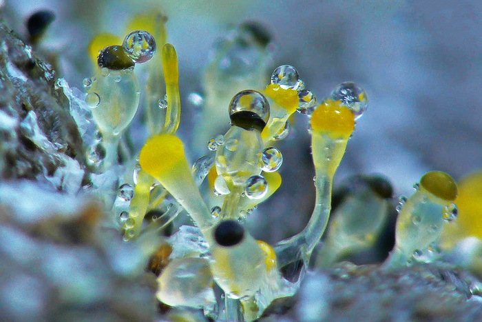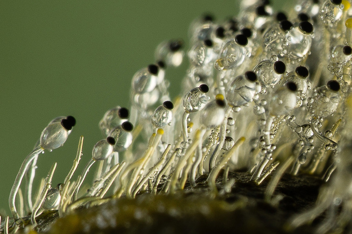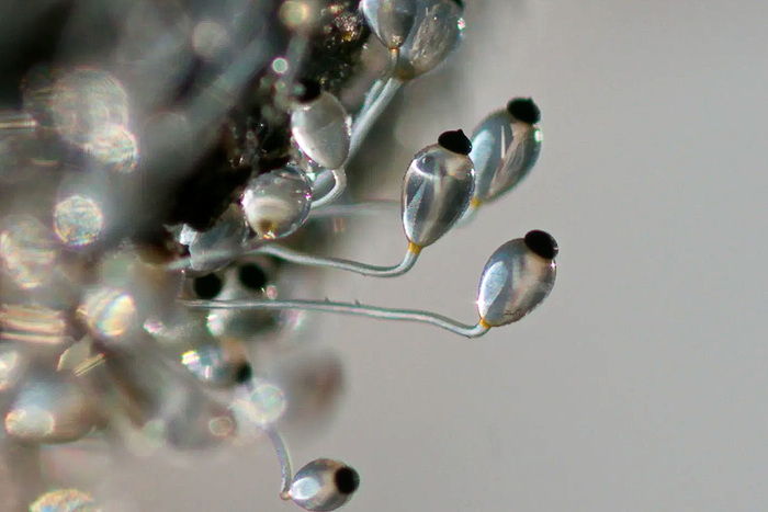 В этих пузырьках содержатся споры гриба. По мере созревания давление внутри становится таким, что срывает колпачок, и споры выстреливают наружу. И я не случайно употребил слово "выстреливают".