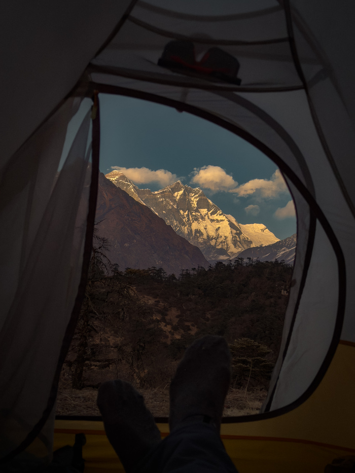 Вечером я уже забрался повыше, где то на высоты 3600+. Вот тут уже свежо! Ночью безветренно и не холодно. Я даже в кофточке прогуляться ходил, а под утро стабильный минус, может около минус 5-7. И тут уже было бы проблематично выбраться в госпиталь, но нога вроде не доставляла никаких особых проблем.
