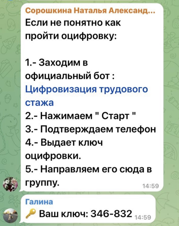 И пишут: надо пройти оцифровку стажа. Бред конечно полный, но не каждый сразу поймет подвох. Тем более, что пишут в «рабочем» чате.