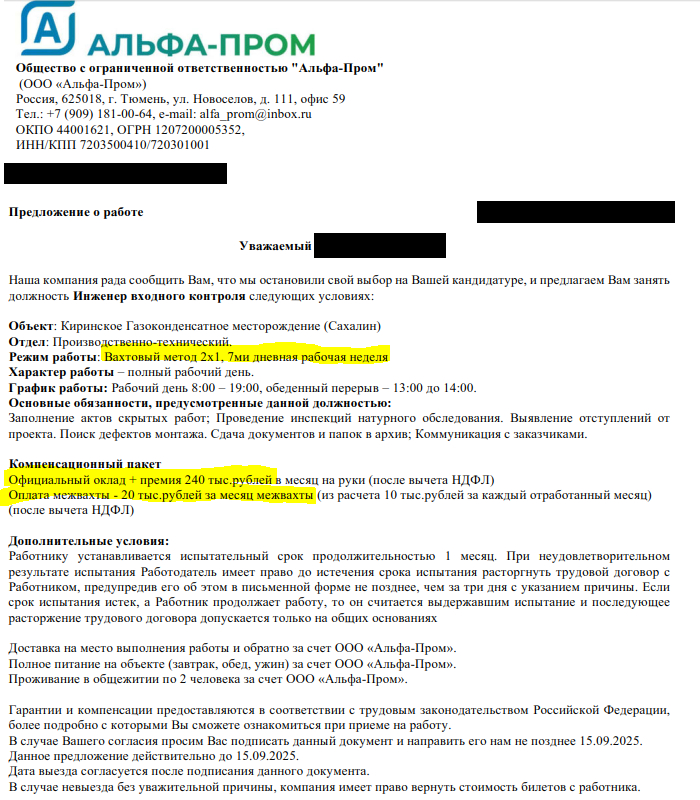 Устроились в компанию вахтовым методом в сентябре 2025. Прислали предложение о работе, где прописаны все условия.