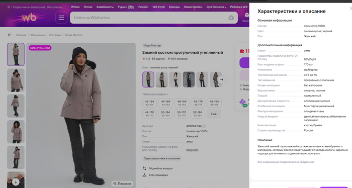 05.01.2026 моя жена забрала с точки выдачи зимний утепленный прогулочный костюм. В характеристиках был указан температурный режим до -25. Ссылка на костюм: https://www.wildberries.ru/catalog/496862344/detail.aspx. На точке выдачи все проверили и поехали домой. В этот же день моя жена одела этот костюм при температуре -5 на теплые легинсы и водолазку. Бирки были сняты, но сохранены. После 20 минут нахождения на улице она очень сильно замерзла.