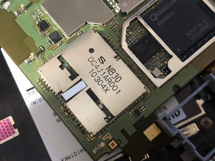 Наш пациент — водолаз. При этом судя по интенсивной коррозии, искупался он в море и за годы простоя коррозия «съела» всю дисплейную плату. При этом сам коннектор шлейфа был визуально в норме и часть пинов с него свободно звонились до межслойных переходов, которые, к слову, здесь вообще не покрыты маской. Однако уже здесь мы видим одну из фишек IS01: Sharp разработала кастомный дисплейный модуль специально для этого смартфона. На нём мы видим отдельный драйвер подсветки, предположительно чип для формирования BIAS-напряжения матрицы и линии тачскрина. Похоже здесь дисплей настолько кастомный, что для его управления используется отдельный чип-контроллер (по аналогии с дисплеями Sony, которым требовался отдельный контроллер на плате) и если он вышел из строя — неудивительно что дисплей отказывается стартовать...