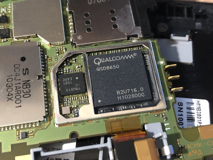 С обратной стороны платы расположилось сердце устройства — чипсет Qualcomm QSD8650, являющийся одним из самых первых процессоров линейки Snapdragon под индексом S1. Будучи представленным в 2008 году, QSD8650 базировался на собственном ядре Qualcomm Scorpio (модифицированный Cortex), работающем на частоте 1ГГц, поддерживал набор инструкций ARMv7 и имел FPU, а за 3D-ускорение отвечал GPU Adreno 200, который представлял из себя переименованный ATi Imageon Z430. При этом Z430'ый — наследник микроархитектуры GPU Xenos в Xbox 360 и по сути был одним из первых массовых мобильных 3D-ускорителей с поддержкой OpenGLES 2.0 и соответственно шейдерного пайплайна. До этого, мобильные GPU в основном были Fixed Function.