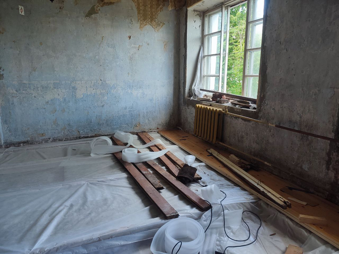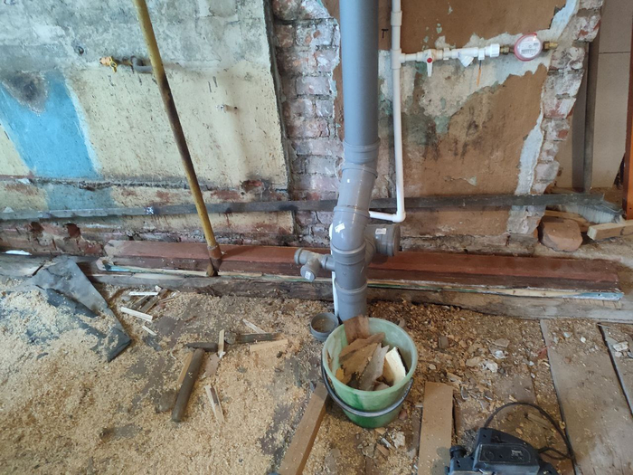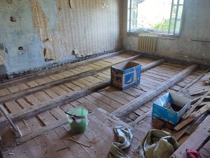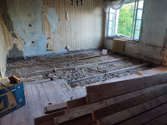 Сносили перегородки меж одной комнатой, кухней и туалетом, снимали полы.
