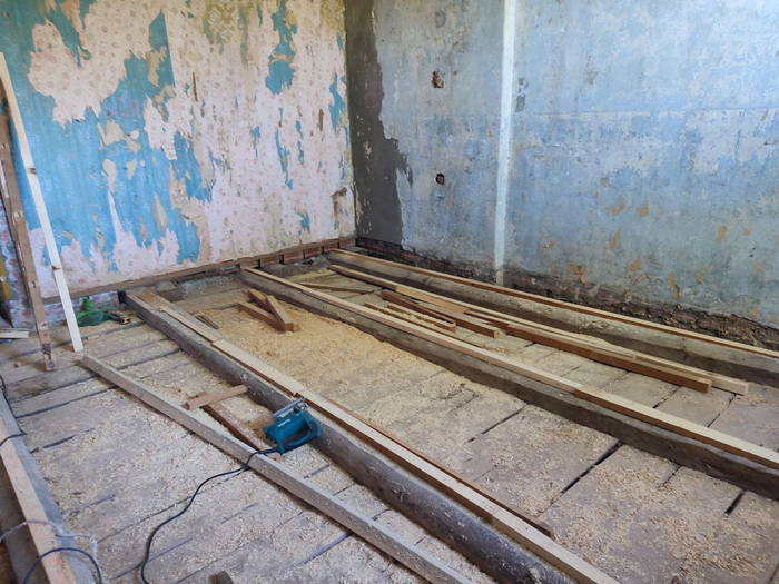 Балки неровные, с провисами, за почти сотню лет то. Выравнивали брусками, которые по лазеру сострагивали.