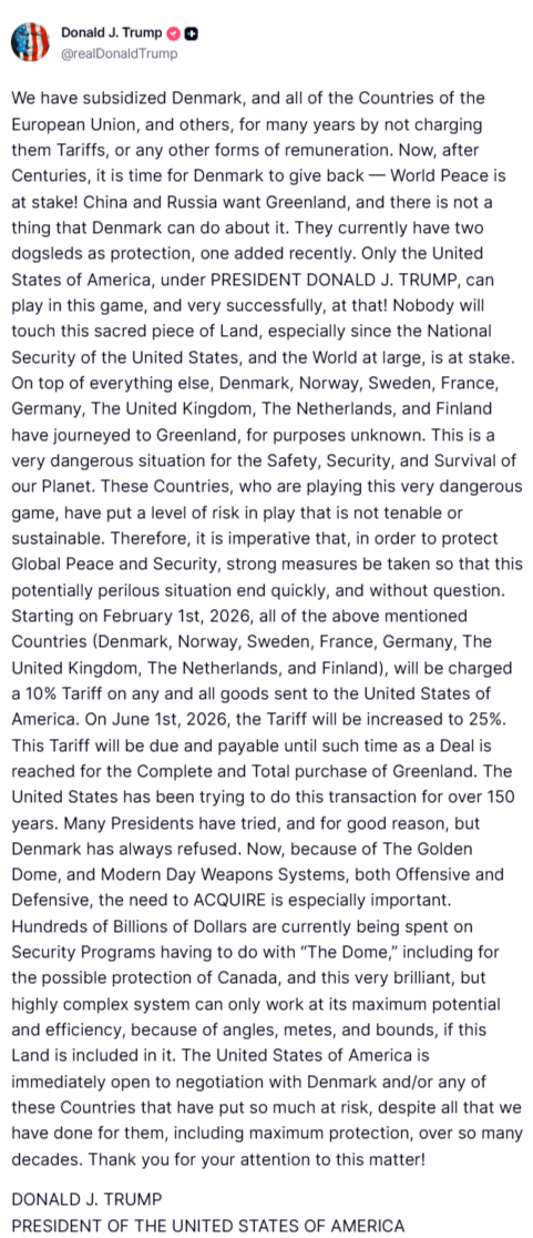 Мы много лет субсидировали Данию, все страны Европейского союза и другие страны, не взимая с них таможенных пошлин или каких-либо других компенсаций. Теперь, спустя столетия, настало время Дании отплатить добром — на кону мир во всем мире! Китай и Россия хотят завладеть Гренландией, и Дания ничего не может с этим поделать. В настоящее время у них есть две собачьи упряжки для защиты, одна из которых была приобретена недавно. Только Соединенные Штаты Америки под руководством президента Дональда Трампа могут играть в эту игру, и притом очень успешно! Никто не тронет этот священный клочок земли, особенно учитывая, что на кону стоит национальная безопасность Соединенных Штатов и всего мира. Вдобавок ко всему, Дания, Норвегия, Швеция, Франция, Германия, Великобритания, Нидерланды и Финляндия совершили путешествие в Гренландию с неизвестными целями. Это очень опасная ситуация для безопасности и выживания нашей планеты. Эти страны, играющие в эту очень опасную игру, создали такой уровень риска, который неприемлем и неустойчив. Поэтому крайне важно, чтобы для защиты глобального мира и безопасности были приняты решительные меры, дабы эта потенциально опасная ситуация быстро и бесспорно завершилась. Начиная с 1 февраля 2026 года, со всех вышеупомянутых стран (Дания, Норвегия, Швеция, Франция, Германия, Великобритания, Нидерланды и Финляндия) будет взиматься 10% таможенная пошлина на все товары, отправляемые в Соединенные Штаты Америки. С 1 июня 2026 года пошлина будет увеличена до 25%. Эта пошлина будет подлежать уплате до тех пор, пока не будет достигнуто соглашение о полной и абсолютной покупке Гренландии. Соединенные Штаты пытаются осуществить эту сделку уже более 150 лет. Многие президенты пытались, и на то были веские причины, но Дания всегда отказывалась. Сейчас, из-за Золотого Купола и современных систем вооружения, как наступательных, так и оборонительных, необходимость ПРИОБРЕТЕНИЯ особенно важна. В настоящее время сотни миллиардов долларов тратятся на программы безопасности, связанные с «Куполом», в том числе на возможную защиту Канады. Эта очень сложная, но гениальная система может работать с максимальной эффективностью только в том случае, если в её состав входит эта территория, учитывая её углы, границы и особенности. Соединенные Штаты Америки немедленно готовы к переговорам с Данией и/или любой из этих стран, которые подвергли себя такому риску, несмотря на всё, что мы для них сделали, включая максимальную защиту, на протяжении многих десятилетий. Благодарим вас за внимание к этому вопросу!